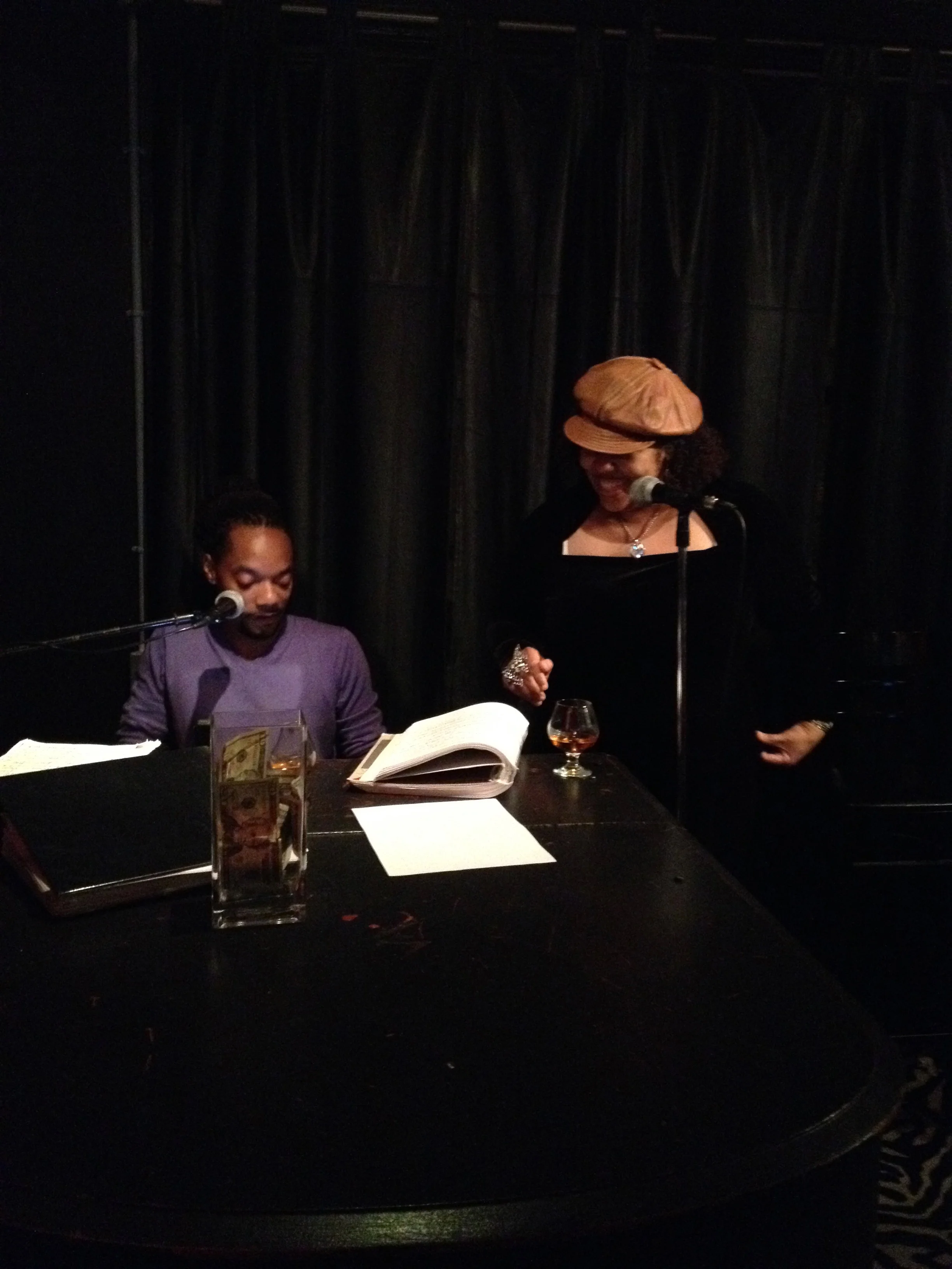 At the mic celebrating a birthday, with V. Shayne Frederick on piano